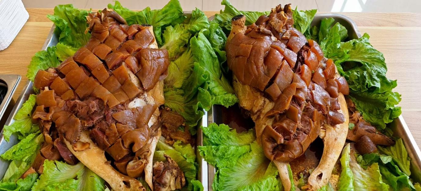 西院二楼教工餐厅的惊喜更是“硬菜”十足!整只烤全羊霸气登场,外皮酥脆、肉质鲜嫩,散发着诱人的香气;还有美味的牛头肉,色泽红亮、酱香浓郁,光是看着就让人食欲大开。食堂师傅们现场为教师们切分定制蛋糕,大家有序领取、分享美味。